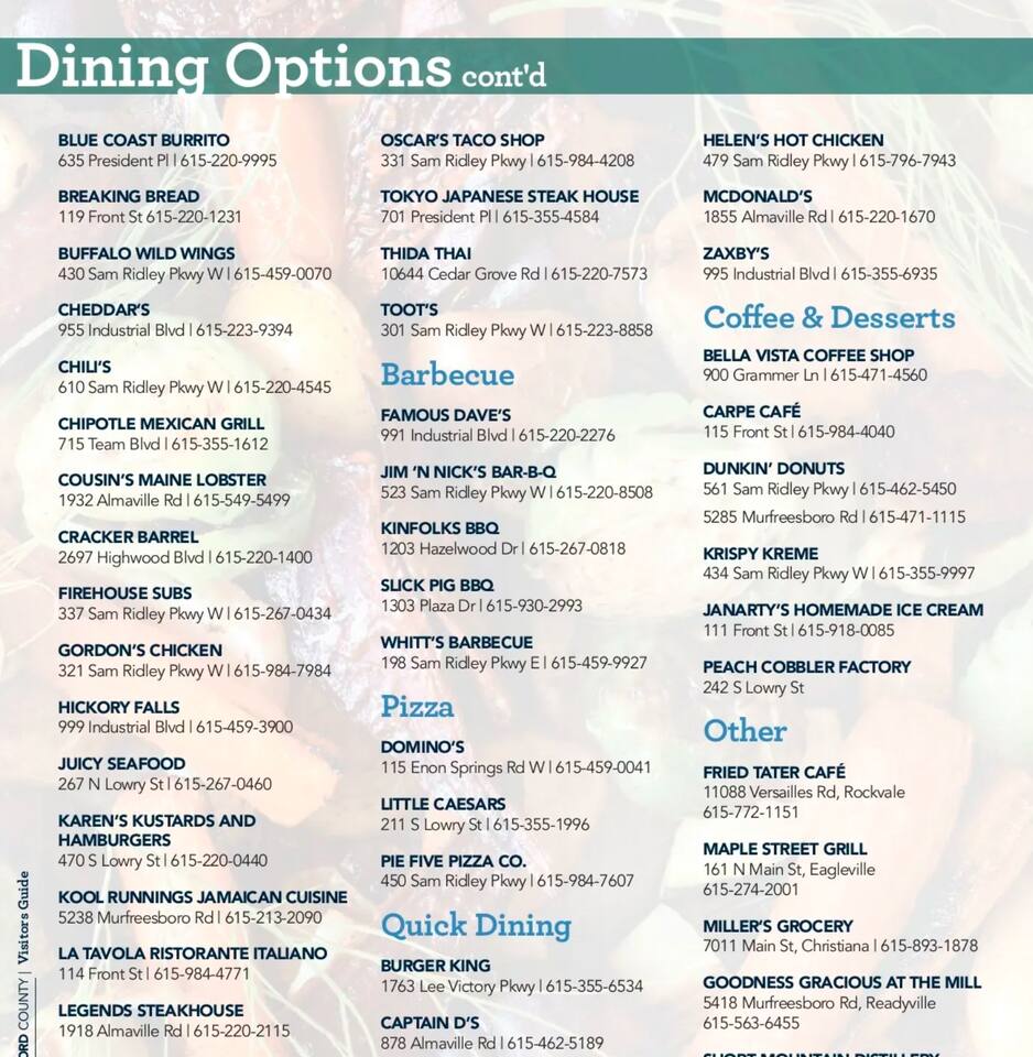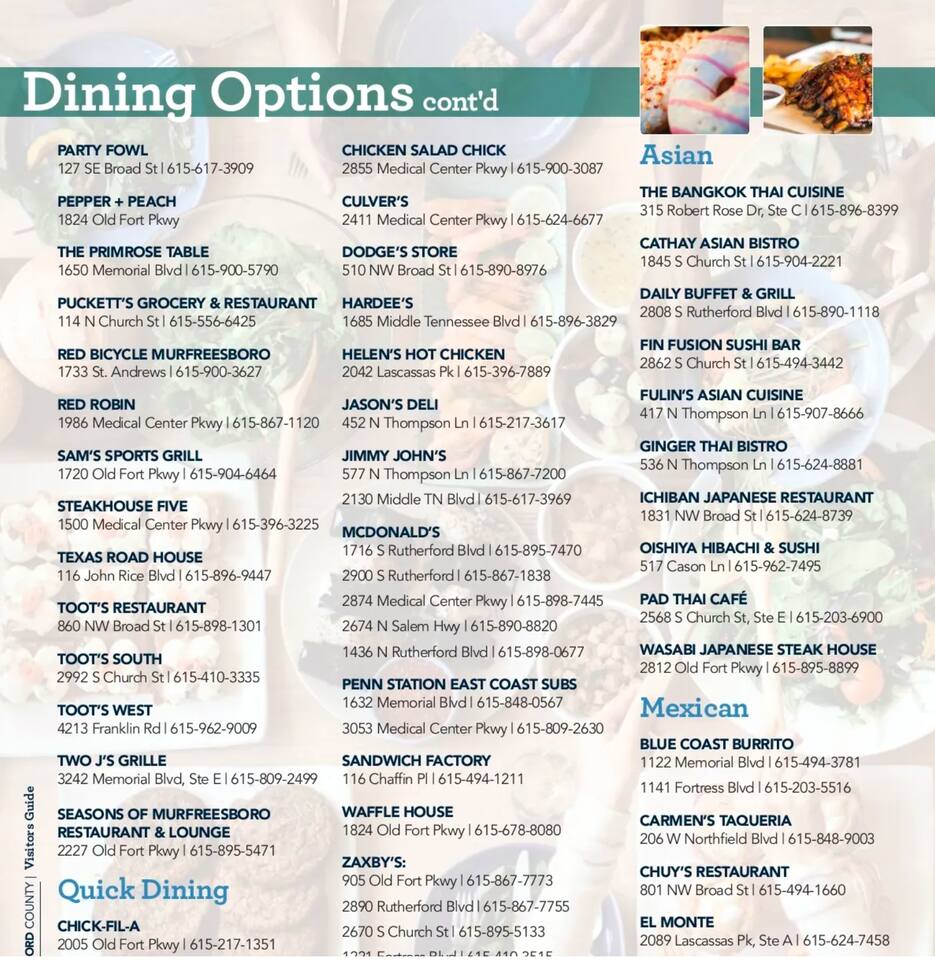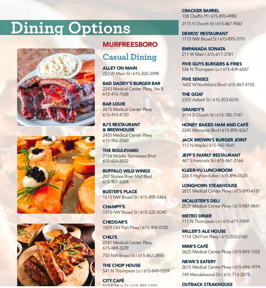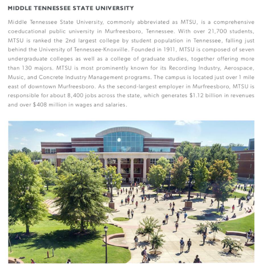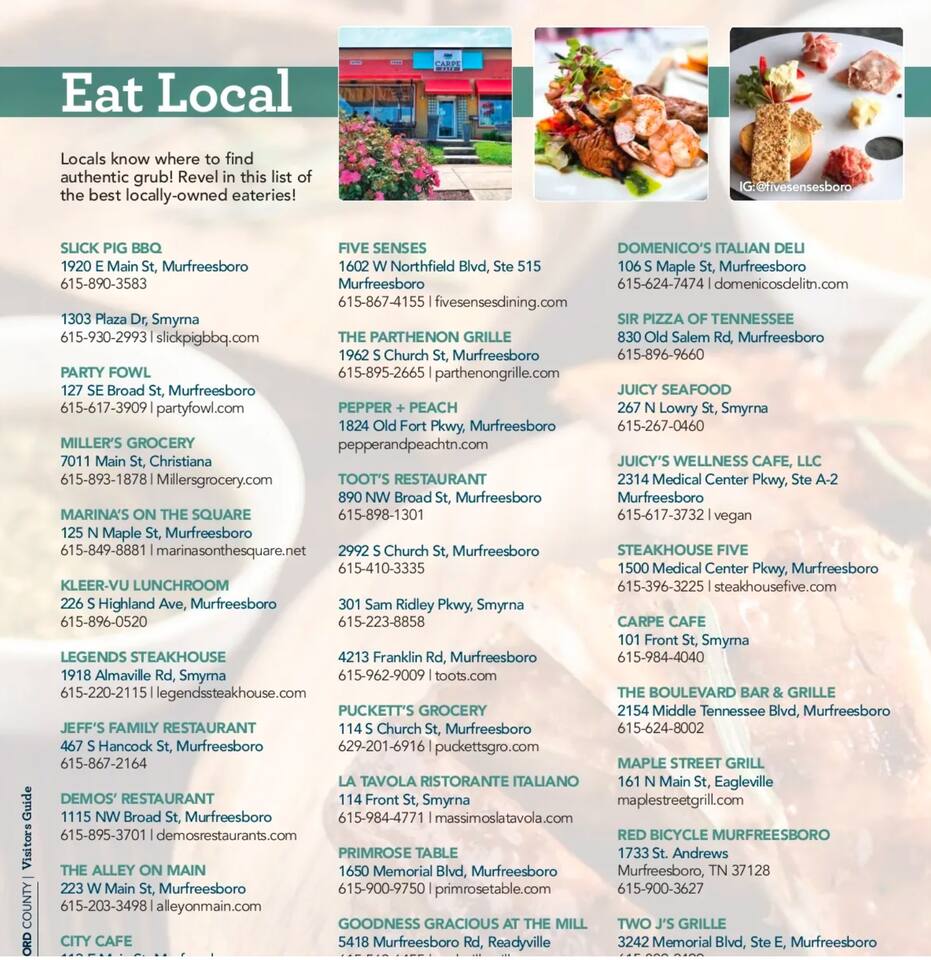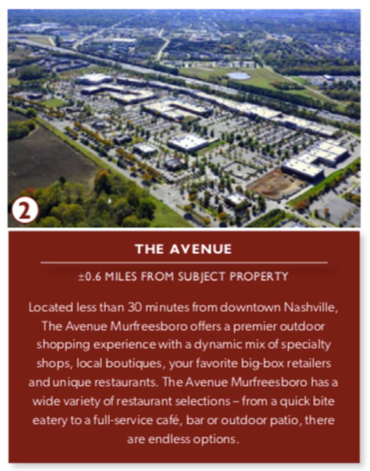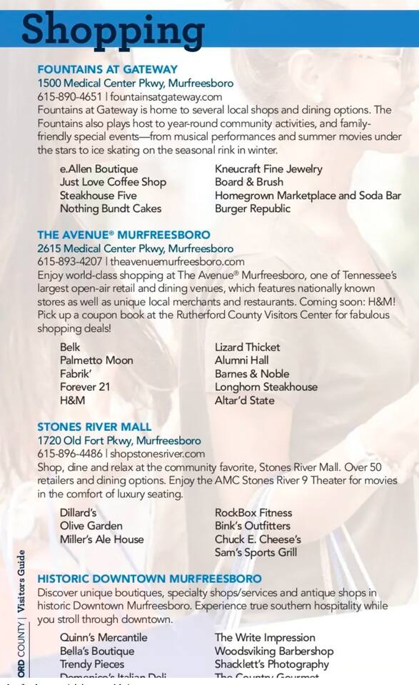 Murfreesboro is located in Middle Tennessee about 25 minutes southeast of Nashville, off I-24. Located in the heart of Murfreesboro. 4 miles from MTSU. 28 miles Southeast of Nashville off I-24. 28 miles East of Franklin. A perfect central location for your traveling needs. Uber and Lyft services Murfreesboro and trips to/from Nashville. There is a limited bus system to/from Nashville. Murfreesboro City has Rover Bus System, 6am-6pm Monday thru Friday. Nearby Restaurants Include: Breakfast/Brunch/Lunch First Watch 0.1miles Metro Diner 0.2mi Firehouse Subs 0.2mi Carrabba's Italian Grill 0.2mi Jimmy John's 0.3mi Panera Bread 0.9mi Lunch/Dinner The Chop House 0.3mi Sal's Murfreesboro 0.3mi Bonefish Grill 0.3mi Tandoor Indian Restaurant 0.3mi Coffee Coffee Fusion 0.06miles The Soda Bar1500 Medical Center Parkway .6mi Starbucks 0.9mi Starbucks 1mi Groceries Gordon Food Service .4mi Aldi .5mi Rutherford County Farmers Market 1mi Kroger 1mi Publix 3.7mi Costco 3.9mi Parks Stones River National Battlefield .4mi Old Fort Park .9mi Stones River National Battlefield 1mi Agricultural Center Ball Park 1.3mi Stones River National Battlefield 1.4mi Cannonsburgh Village 2.1mi Stones River National Battlefield 2.2mi Oaklands Park 2.5mi #MurfreesboroTN #TheGatewayVillage #MiddleTennessee #Nashville #StThomasRutherfordHospital #TheAvenueMurfreesboro #Murfreesbo #ProperStays