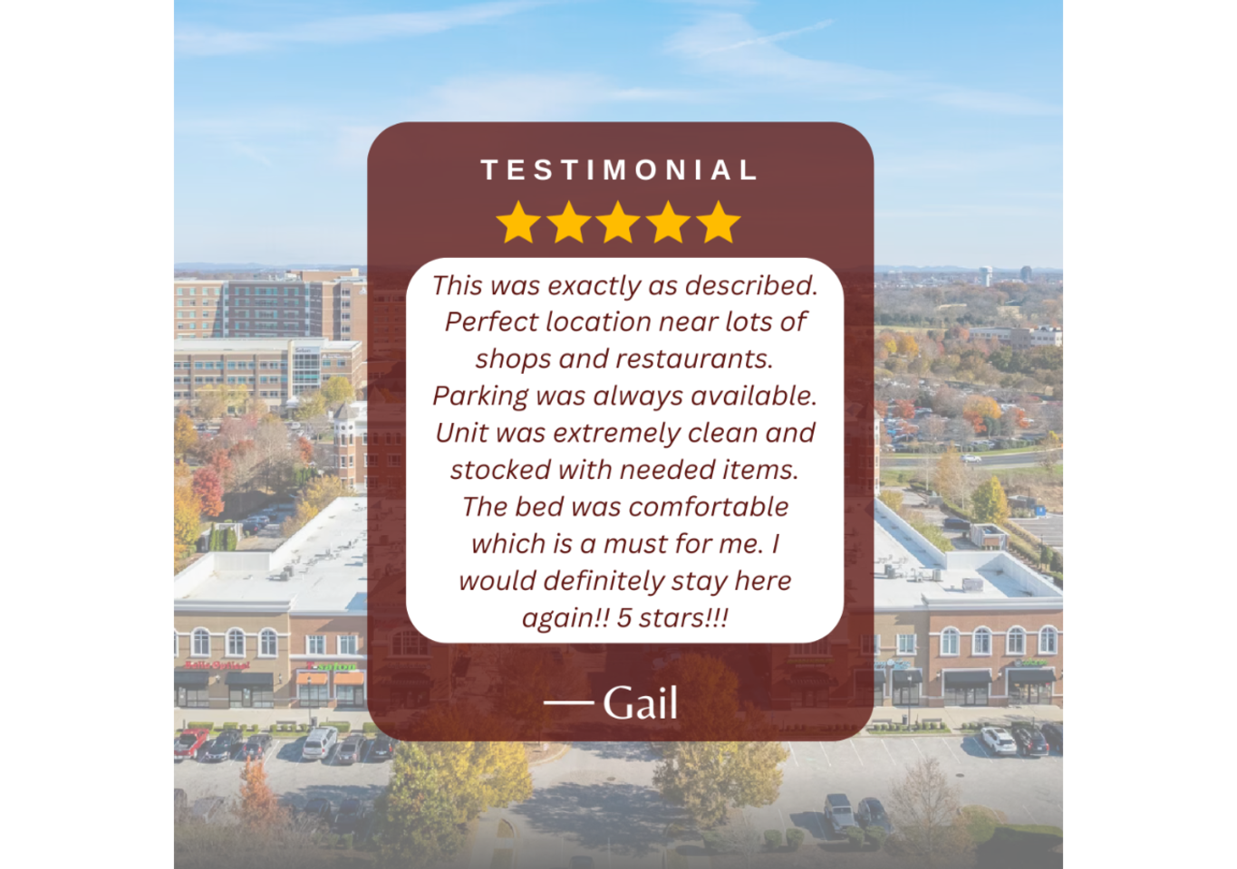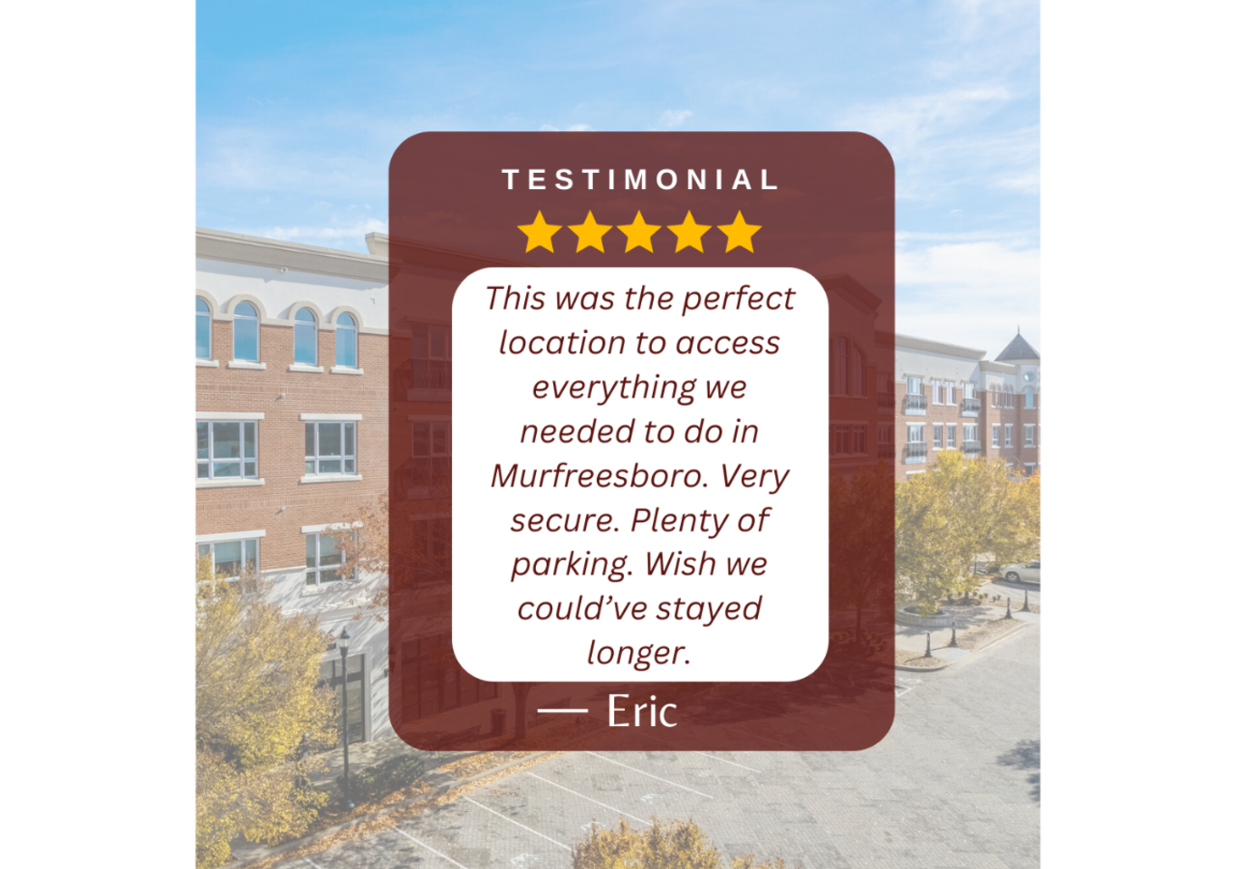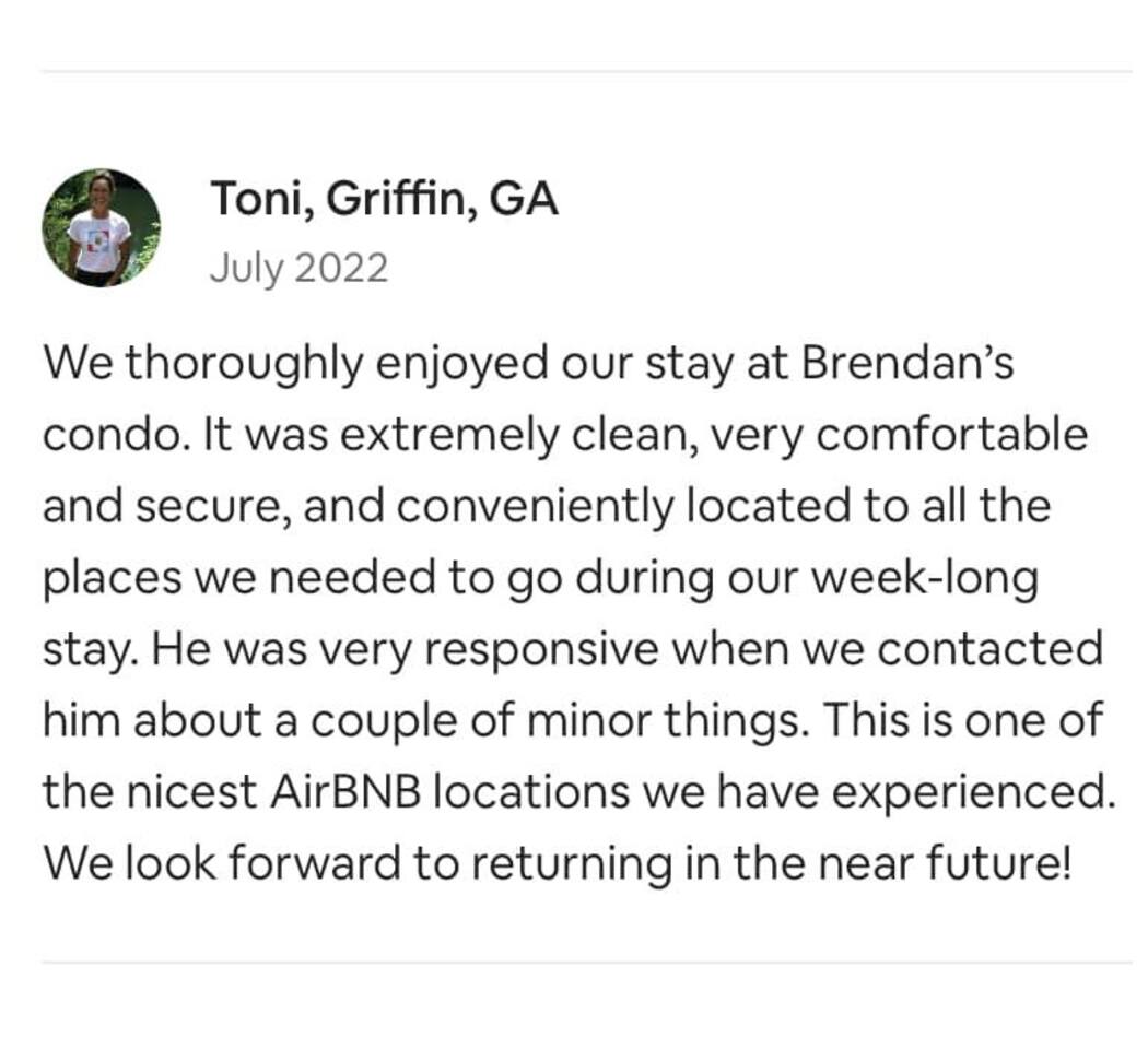 The Condo is located in a mixed-use development of upscale residential condominiums, lofts and shops called The Gateway Village. The Gateway Village is in the perfect centralized location in Murfreesboro, TN. Murfreesboro is about 30-minutes Southeast of Nashville and about 90-minutes Northwest of Chattanooga. We have unobstructed views of The towns 4th of July Fireworks display from our 4th Floor Veranda. Nearby are popular restaurants, grocery stores, medical offices and retail stores. Murfreesboro is home to the state’s second largest university, Middle Tennessee State University. Murfreesboro is in Rutherford County, one of the fastest growing counties in the state due to its proximity to the state capital. We have a quiet neighborhood, but are only 3 miles to downtown Murfreesboro, MTSU, and 2 miles to the interstate. Enjoy day trips into Nashville, a short 25 miles away, down I-24. We are located 200ft from Saint Thomas Rutherford Hospital, the leading healthcare provider in Rutherford County. The hospital offers 286 all-private patient rooms that provide a high-quality healing environment for patients. Murfreesboro has a beautiful Greenway System that meanders beside the Stones River. (5 min walk away!) We also boast the historic Civil War Stones River Battlefield and Cemetery. (5 min walk away!) The ‘Boro has fabulous places to shop including delightful boutiques on the historic square (5 min drive away). You can find all the shopping you could ever want at The Avenue and Stones River Mall. Both less than 1 mile away. There are numerous parks, golf courses and an amazing children's museum called the Discovery Center. Our online guidebook will help you navigate all there is to do in Middle TN! Come and stay for awhile! #MurfreesboroTN #TheGatewayVillage #MiddleTennessee #Nashville #StThomasRutherfordHospital #TheAvenueMurfreesboro #Murfreesbo #ProperStays