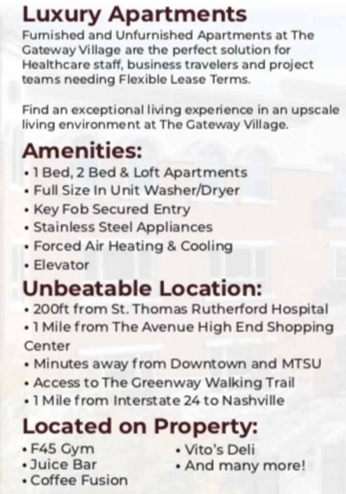 Discover luxury at The Gateway Village! Ask Us For Your Discount For: *3-Month Stay *6-Month Stay *9-Month Stay Enjoy full kitchen, high-speed internet, and on-site perks like Juice Bar, Coffee Fusion, GYM. Next to St. Thomas Rutherford Hospital, premier shopping at The Avenue Murfreesboro, and short drive to Nashville. We offer a Loyalty Discount for guests who have at least 5 positive reviews and a 5+ year account history on this platform. Please message us for your special rate!