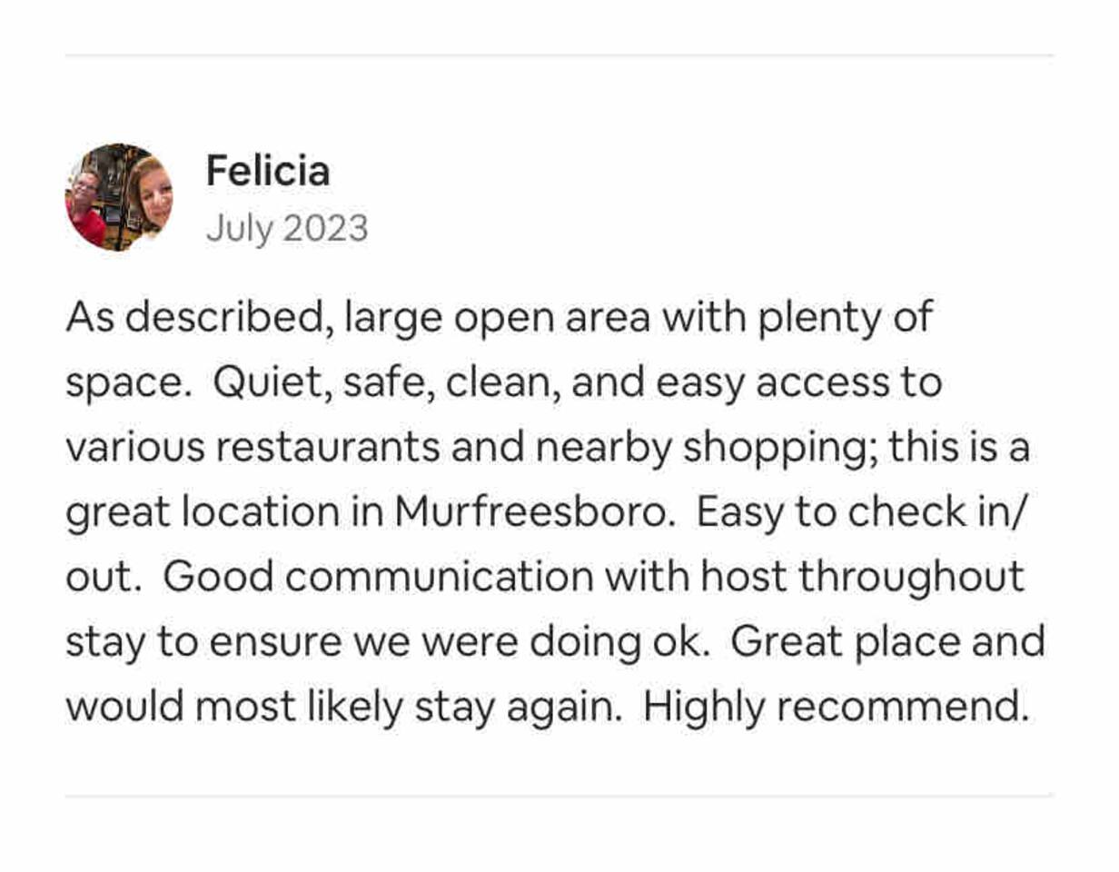We offer a Loyalty Discount for guests who have at least 5 positive reviews and a 5+ year account history on this platform. Please message us to confirm eligibility and receive your special rate! Please treat the space with respect • No smoking, parties, or pets without prior approval • Ideal for families, corporate groups, and friends • Available for short, mid, and long term stays ========================================================= MAIL AND PACKAGE DELIVERY: We do not recommend having packages delivered directly to the building or apartment. We have had packages lost in the past. To guarantee that you receive your mail and packages, we recommend using a nearby pickup or drop-off location. Please ensure your AC thermostat is set no lower than 71 degrees during the summer. Setting it lower can overwork the system, causing ice formation and potentially leading to malfunctions. Thank you for your understanding and cooperation. Check In Timeframe is 4:00 PM CT to 10:00 PM CT ========================================================= Q: What is the total booking price? A: We're unable to provide an exact figure. The total cost, including fees and taxes, will be displayed once you enter your dates. Please note that pricing can change daily and may vary. ========================================================= Monthly Rent: • $150 monthly pet rent ========================================================= The Gateway Village has the HVAC filters scheduled to be changed out every 2 months. Tobin the Gateway Village Maintenance man will need to briefly access your unit during business hours 9am-4pm in order to remove the old filter and replace it with a new one. #MurfreesboroTN #TheGatewayVillage #MiddleTennessee #Nashville #StThomasRutherfordHospital #TheAvenueMurfreesboro #Murfreesbo #ProperStays if